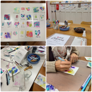 8 Frauen trafen sich im Vereinsraum, um in die Welt des Handletterings einzutauchen. Alexandra Zimmermann zeigte Schritt für Schritt die Grundlagen der verschiedenen Schriften und Stile. Während 3 Stunden wurden Formen und Schriften geübt und auf Karten aufgetragen. Damit zu Hause weitergeübt werden kann, durfte Handbuch und neue Stifte mit nach Hause genommen werden.